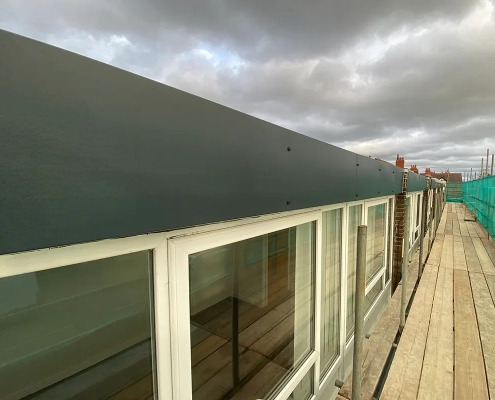 - Supplied and installed pre finished powder coated flat sheets with return flashings to the top and bottom of each panel